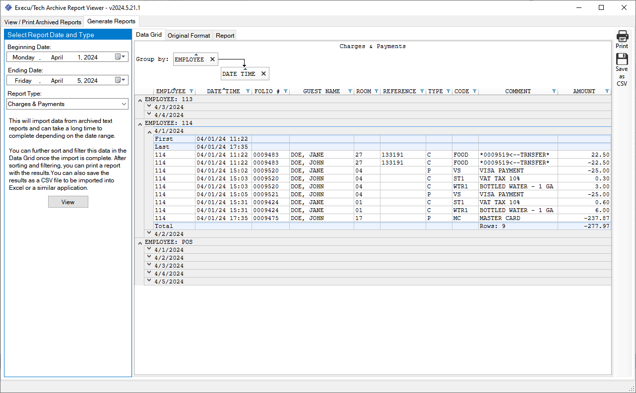 The report viewer can also sort and filter data from the final Charge and Payment Journal created by the night audit process. You can import a date range, sort and filter, then print or export as a CSV file to be used in Excel or other applications.