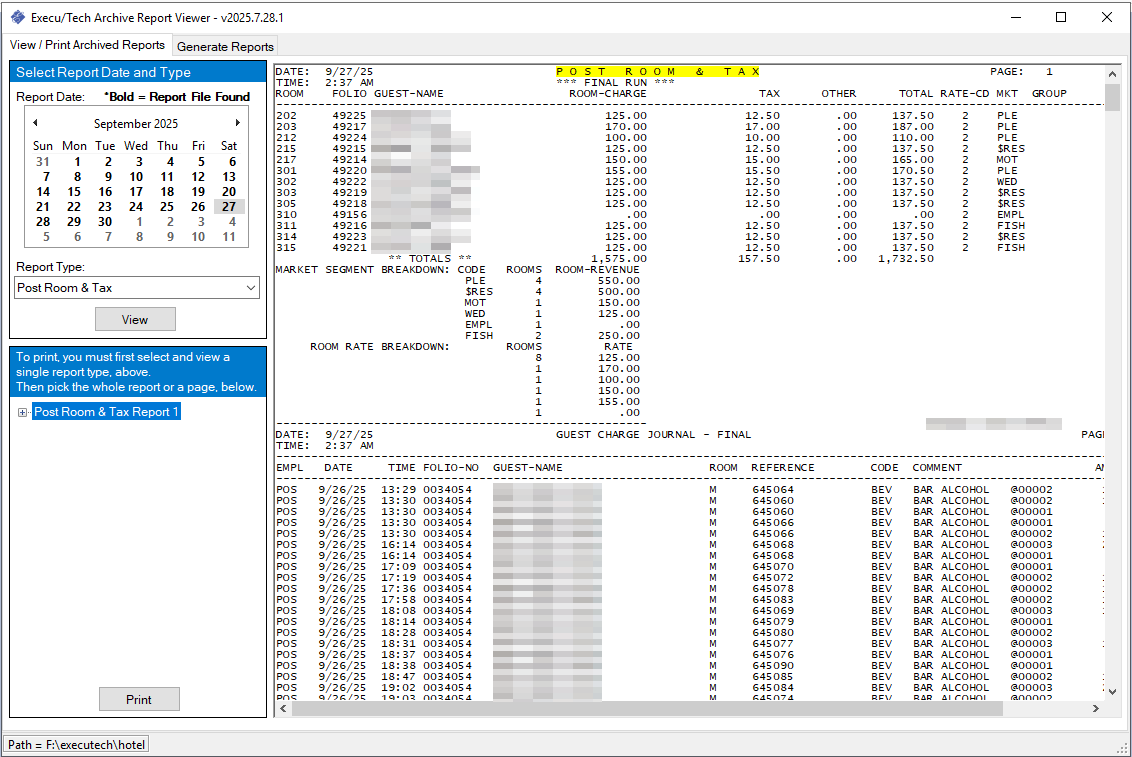 To view and print all reports that were printed during night audit, you can use our Archive Report Viewer. This is especially helpful since some of the reports cannot be reprinted, such as Final Post Room & Tax and Final Recap.