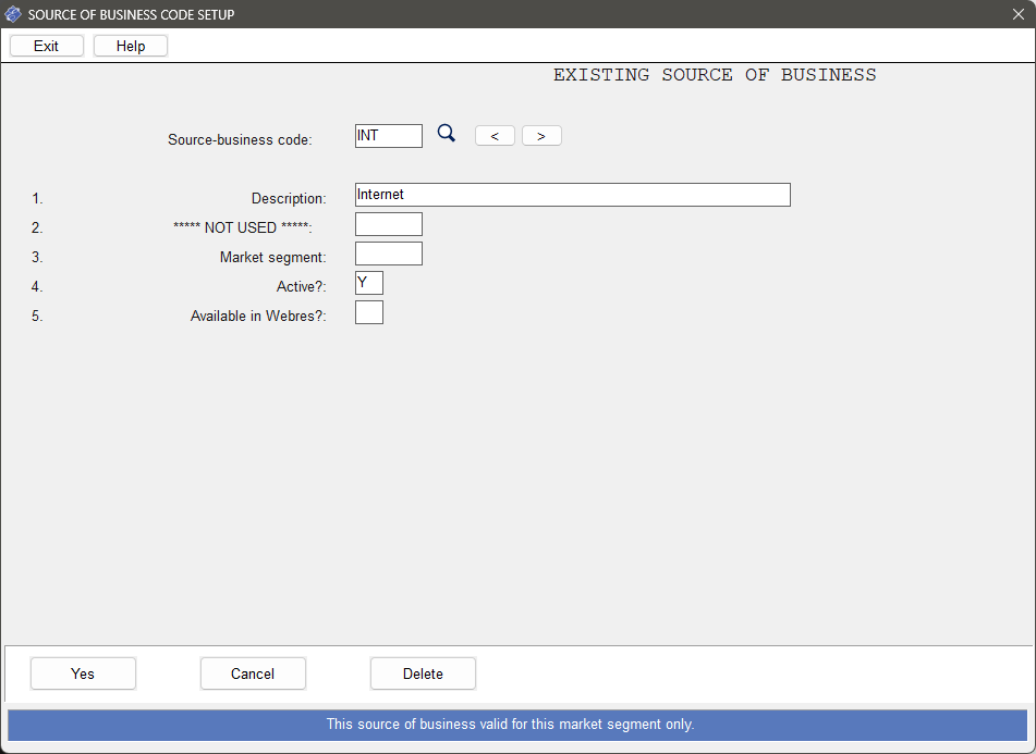 4. Active? may be set to N if you do not wish this source of business to display at look-up. 5. Available in WebRes? should be Y if you want this source of business code available for use in WebRes ("How did you hear about us?", etc.)