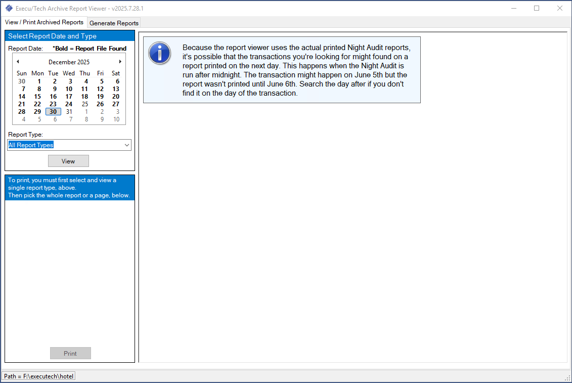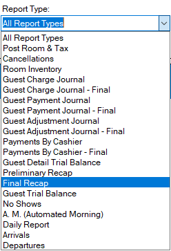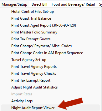 To view and print all reports that were printed during night audit, you can use our Archive Report Viewer. This is especially helpful since some of the reports cannot be reprinted, such as Final Post Room & Tax and Final Recap.