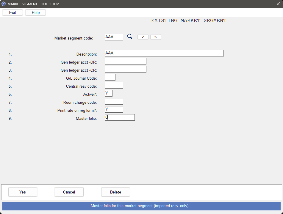 9. Master folio: used for imported reservations only. Enter the master folio for this market segment.