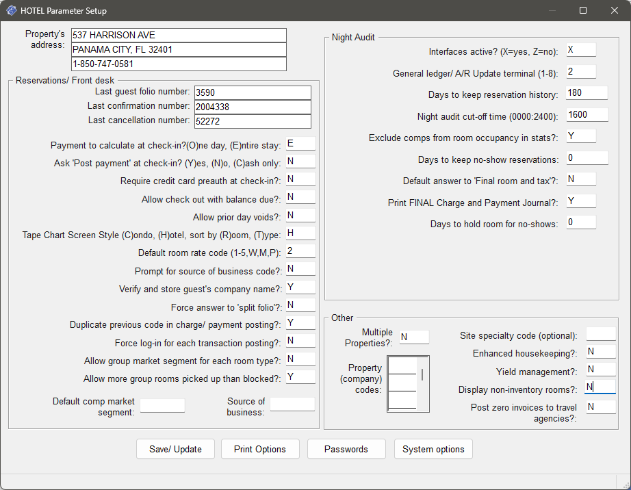 Go to Manager/Setup > Hotel Control Files Setup > Parameter Record. You should consult Execu/Tech support prior to editing any field in the Parameter Record. The Parameter Record is divided into four sections: Property's address; Reservations/Front Desk; Night Audit; and Other. Two buttons at the bottom of the screen open new windows: Print Options and Passwords. The System Options button is for older systems and is no longer applicable. "Property's Address" will print on your confirmation letter, registration form, folio, and direct bill customer statement. Thirty characters will print for each line. The address may be in any format. "Last guest folio number" sets the next sequential folio number and should never be changed by you once you have started using Execu/Suite. "Last confirmation number" sets the next sequential reservation confirmation number and should never be changed by you once you have started using Execu/Suite. "Last cancellation number" sets the next sequential reservation cancellation number and should never be changed by you once you have started using Execu/Suite. "Payment to calculate at check-in?(O)ne day, (E)ntire stay:" determines whether the amount of room and tax charges for one day only or for the entire stay will display on the check-in screen. Enter O or E in the field. "Ask 'Post payment' at check-in? (Y)es, (N)o, (C)ash only" if set to Y will pop up a "Post payment now?" prompt for all payment types at completion of the check-in process. C will display the prompt for cash payments only. N will not display the prompt. NOTE: When the prompt displays, users may answer No to the prompt and continue the check-in without posting payment. NOTE: You should not set this to Y if your policy is to preauthorize credit cards at check-in. Credit cards that are preauthorized will be charged at check-out and should not be posted at check-in. If you preauthorize credit cards, you should set this field to C (for cash payments only) or to N (not to prompt, regardless of payment type). "Require credit card preauth at check-in?: may be set to Y, N, or X. It should be set to Y if your hotel's policy is to preauthorize a guest's credit card at check-in if a credit card payment type is entered in the "payment type" field on the check-in folio screen. This will force the user to preauthorize a credit card and eliminate the error of allowing a guest with insufficient credit to pay for the stay. Set the field to N if you do not require a credit card to be preauthorized at check-in or if you charge the guest's card at check-in (as opposed to authorizing only). With the N setting, you will see a prompt, "process credit card?" at check-in if the payment type is a credit card and you can select "yes" or "no" to the prompt. If this field is set to X the check-in will proceed without the prompt "process credit card?" although you may still preauthorize a credit card by clicking the "authorize card" button. Note: You should not both preauthorize and charge the same card at check-in. If this field is set to Y make sure to set "Ask 'Post payment' at check-in?" to N or C. "Allow check out with balance due?" should be set to N except for special circumstances. If a folio has a balance at the time of check-out, payment should be posted, adjustments should be charged, transactions should be transferred to a different folio, or the balance should be direct billed (if appropriate). The folio balance should be zero once the guest has departed. Folios should not sit with balances once the guest has checked out. Likewise, group master folios should have zero balances after the group has departed, and the master folios should be checked out. "Allow prior day voids?" should be set to N except for special circumstances. Prior-day voids will put you out of balance for the current day (as you cannot "undo" a prior day's activity) and are discouraged in good accounting practices. Adjustments can be posted to prior-day transactions. "Tape Chart Screen Style (C)ondo, (H)otel, sort by (R)oom, (T)ype" determines how rooms are sorted in the Rooms or Tape Chart display. C sorts the rooms in order of usage (lesser-used rooms to most-used rooms). H sorts by room number. R sorts by room number with an additional button at the bottom of the screen, 'Sort by type/ usage' allowing you to sort by room type rather than by room number. Within the type, lesser-used rooms will display before higher-used rooms . When clicked, the button will change to 'Sort by room number' allowing you to change back to sort by room number. T sorts by room type with an additional button at the bottom of the screen, 'Sort by room number' allowing you to sort by room number rather than type. When clicked, the button changes to 'Sort by type/ usage' allowing you to change back to sort by type. "Default room rate code (1-5,W,M,P) sets the default rate code for new reservations and check-in folios. 1-5 are rate codes typically highest to lowest and are defined in Rooms setup and in Room Types setup. W is weekly. M is monthly. P is package. This field defines the default to populate reservations and folios. Rates are set up in Rooms or Room Types. The rate code may be changed individually for each reservation or folio, if the user's security level allows. "Prompt for source of business code?" should be set to Y. "Verify and store guest's company name?" should be set to Y if you use the Corporate File for setting rates and discounts and if you wish to track these. Setting this to Y will disallow the user to enter a company that does not exist. If you do this, you should train staff to look up companies by name rather than simply entering companies; otherwise, you may end up with ABC Company, ABC, A.B.C, and ABC Co for the same company. This happens because the user sees the message that the company doesn't exist (since the user entered a different spelling than is already in the system) and therefore sets up the company new. To use existing compa
