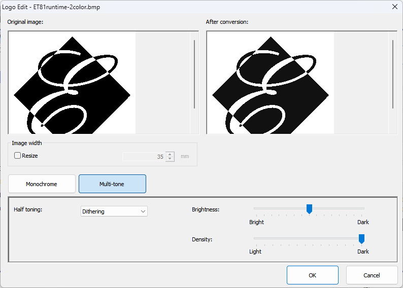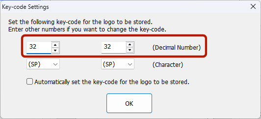 Only logos stored in Key-Code 32,32 will be used. Logos always print centered.