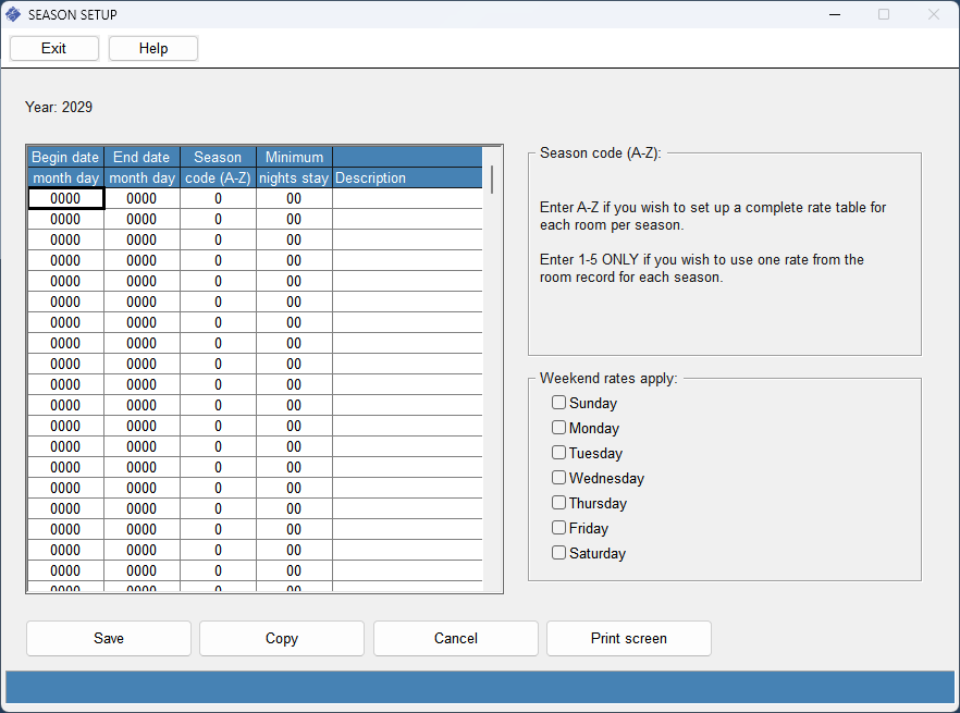 This image is an example of a BLANK Season Record for 2029 that will work for WebRes and no affect the PMS. If you configure it with Begin and End Dates, it will affect both WebRes and the PMS, so just leave it blank if you're not ready to commit to properly configuring it.